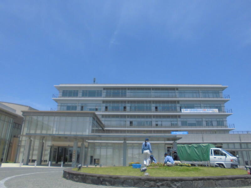 3年生活デザイン科、地域創造コースの生徒で山鹿市役所の玄関前ロータリー花壇の植え替えを行いましたにっこり