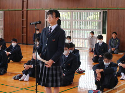 ① 生徒会長から歓迎の挨拶