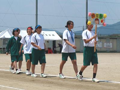 午後のプログラムのスタートです。 プログラムNo.13 部紹介行進・部対抗リレー <部紹介行進> 野球部 サッカー部 陸上競技部 ソフトテニス部 パフォーマンス付きでした。 柔道部 卓球部 バドミントン部 バスケットボール部 パフォーマンス付きです。 郷土芸能伝承部 食品加工部 茶道部 調理部 百人一首部 フラワーアレンジ同好会 イラスト同好会 <部対抗リレー> パフォーマンスの部 優勝は野球部でした。