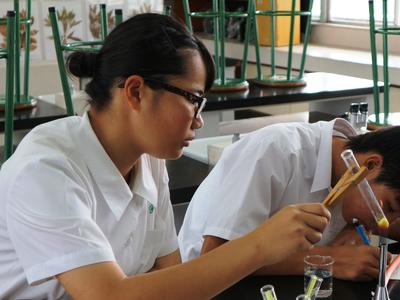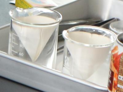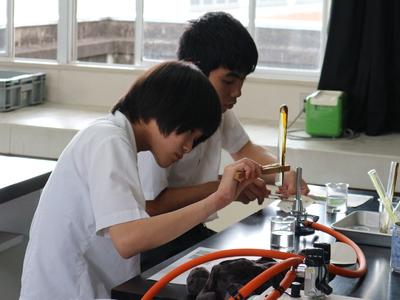 2年食品工業科の化学基礎の授業で、硫黄の同素体の実験を行いました。 同素体というのは同じ元素の単体(1種類の元素からできている物質)なのに、性質が違うものどうしをいいます。今回は硫黄Sの3種類の同素体を観察しました。 1 斜方硫黄 一番安定した状態、つまり普通の硫黄です。 粉末にしてあるのでわかりませんが、大きな結晶をつくると8面体になります。 2 単斜硫黄 粉末硫黄(斜方硫黄)を穏やかに加熱して溶かします。 これを折ったろ紙に流し入れ 表面が冷えて固まってきたら、一気に開きます。 すると 針状の結晶ができます。これが単斜硫黄です。 ルーペで観察してみましょう 3 ゴム状硫黄 粉末硫黄(斜方硫黄)をしっかりと加熱します。だんだん色が黒くなり流動性がなくなってきます。それでも加熱を続けると、再度流動性が出てきます。 そこまで加熱できたら、水の中に一気に流し入れます。 ピンセットで取り出してみると、 ゴムみたいに弾力があります。 これがゴム状硫黄です。(そのまんまの名前ですね) 最後に、3つの同素体について色や性質などの違いをまとめ、レポートを完成させました。 <生徒の感想より> ・硫黄は熱したり、水に入れたりするとすぐに変化したのでおもしろかったです。 ・色や性質が変わったり、ネバネバになったりして、変化をみれたので良かった。 ・ゴム状のはのびがすごかった。 ・ゴム状のやつはう〇こみたいでした。 ・頭が痛くなるようなにおいでした。 硫黄の匂いとゴム状硫黄が印象に残ったようです。 |