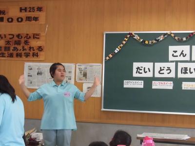 生活科学科では、大道保育園の園児さんたちと交流学習を行いました。今回は、サツマイモの苗植えです。 まずは、紙しばいです。 園児さんたちは、今回も大変楽しみにしてくれていたようで、暑い中、手袋を保育園からはめてきてくれました。 ねえねえ、早く畑に行こうよ。 なぜか、大人の園児さんも(?) 後は、ひたすらサツマイモを植える、植える。 あっち向いたり。 こっち向いたり。 そして、みんなで並んで、植える。 もう、疲れたねぇ。 いやまだ、植えようよ。待ってー。 最後に、指遊びをして。 カエルさんのプレゼント。 それから、お姉さんお兄さんに名前を覚えてもらおうと、園児さんはおそろいのユニフォームでした、何と素敵なことでしょう! 大道保育園のみなさん、暑い中、ありがとうございました。 サツマイモ、しっかり育てますね。がんばります。
