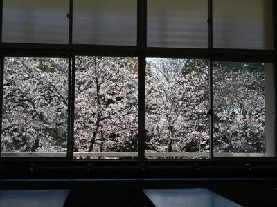 窓一面、桜です。実際に見ると、写真では伝わらない迫力に圧倒されます。この時期に授業がないのが残念です。
