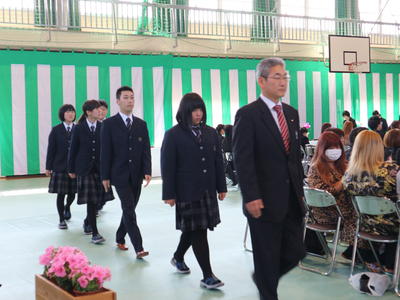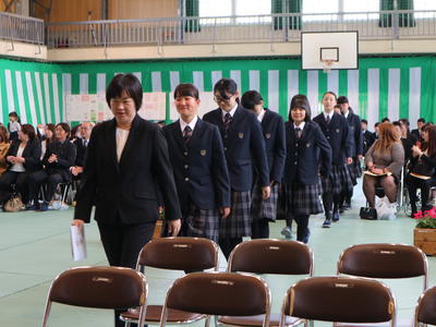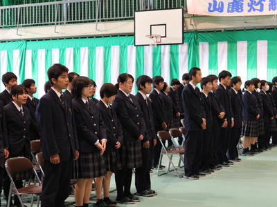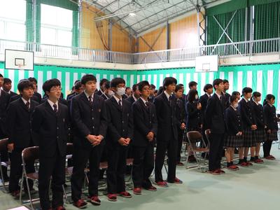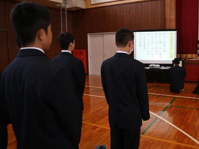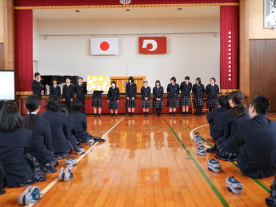 校歌斉唱 後方で2・3年生の三部会役員が大きな声で披露しました。