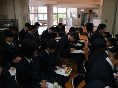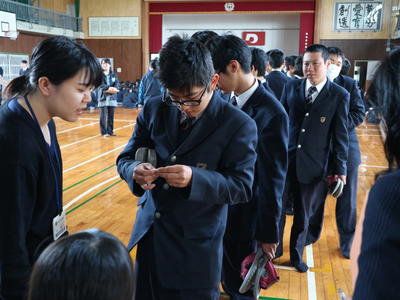 今年度から体育大会は5月開催になり(5/11予定)、団編成も赤団・青団の2団編成になります。集会の最後に団分けのくじを引き、各ホームルームに戻りました。