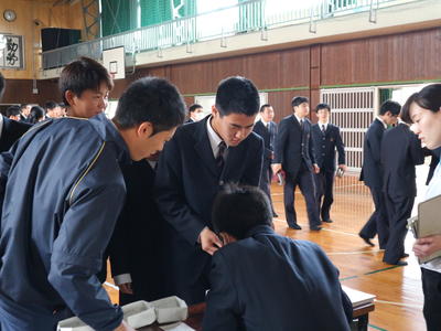 制服の着こなしについて話があった後、ネクタイを結ぶ練習をしました。