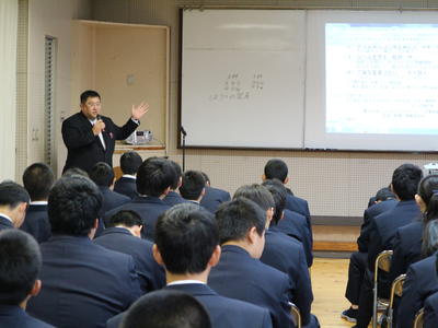 「目標は、実社会に通用する力を身につけ、自立(律)する!です。そのためには・・・。」基本的な生活習慣を身につけるために大切なことについて話してくださいました。