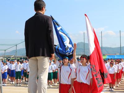 晴天すぎるほどの青空の下、令和元年度の体育大会が行われました。その様子を数回に分けて紹介します。 プログラムNo.1 開会式 開会宣言 生徒会副会長 国歌斉唱ならびに国旗・県旗・校旗掲揚 校長あいさつ 生徒会長あいさつ 競技上の注意 体育副委員長 代表選手宣誓 各団団長 ラジオ体操 ここから採点競技となります。 (つづく) |