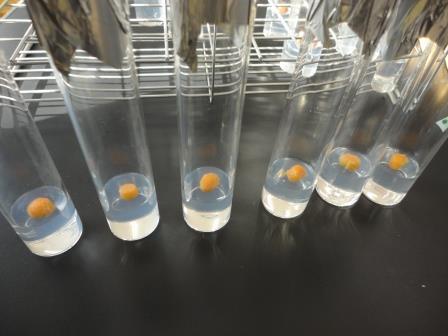 実験後の試験管です。試験管の中にオレンジのニンジンがあるのが見えますか?