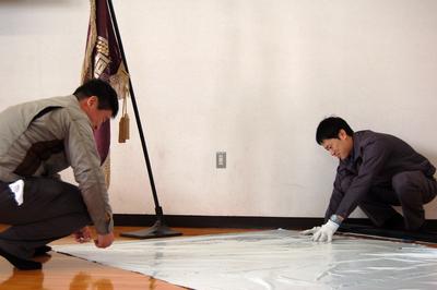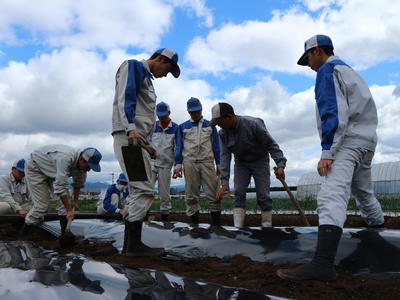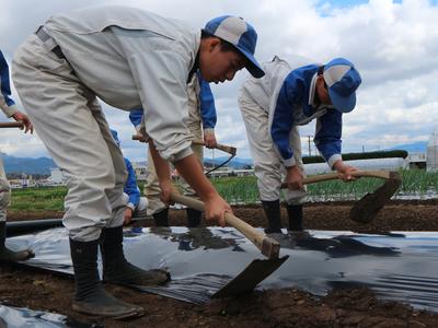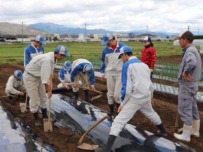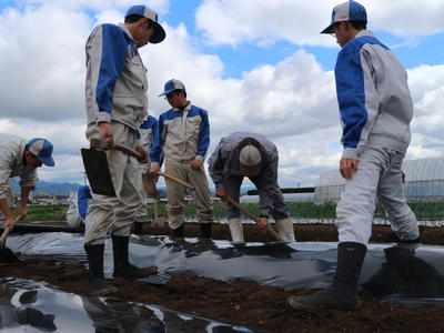 圃場で2年生Aコース(農業自営コース)の生徒が、マルチ張りの実習を行っていました。 Aコースは将来就農する生徒も多く、より実践的な「コツ」が伝授されます。 どうやったらマルチがピンと張れるか?足の使い方や鍬の使い方、土のかけ方など、先生のお手本を見ながら実践しました。 |