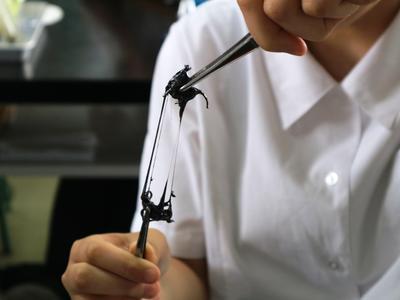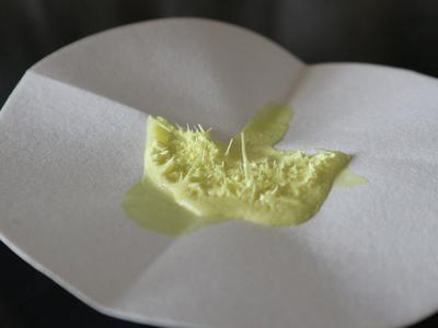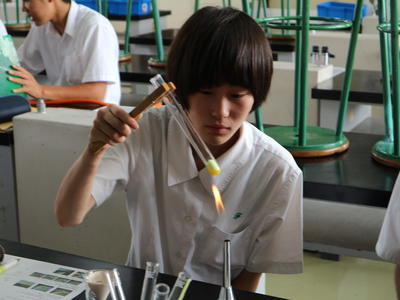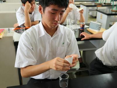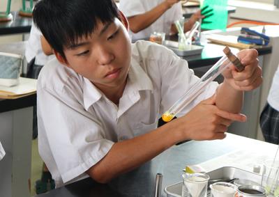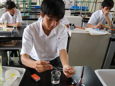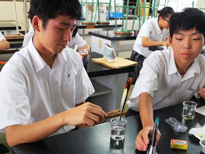 2年食品工業科の化学基礎の授業で、硫黄の同素体の実験を行いました。 同素体というのは同じ元素の単体(1種類の元素からできている物質)なのに、性質が違うものどうしをいいます。今回は硫黄Sの3種類の同素体を観察しました。 1 斜方硫黄 一番安定した状態、つまり普通の硫黄です。 粉末にしてあるのでわかりませんが、大きな結晶をつくると8面体になります。 2 単斜硫黄 粉末硫黄(斜方硫黄)を穏やかに加熱して溶かします。 これを折ったろ紙に流し入れ 表面が冷えて固まってきたら、一気に開きます。 すると 針状の結晶ができます。これが単斜硫黄です。 ルーペで観察してみましょう 3 ゴム状硫黄 粉末硫黄(斜方硫黄)をしっかりと加熱します。だんだん色が黒くなり流動性がなくなってきます。それでも加熱を続けると、再度流動性が出てきます。 そこまで加熱できたら、水の中に一気に流し入れます。 ピンセットで取り出してみると、 ゴムみたいに弾力があります。 これがゴム状硫黄です。(そのまんまの名前ですね) 最後に、3つの同素体について色や性質などの違いをまとめ、レポートを完成させました。 <生徒の感想より> ・硫黄は熱したり、水に入れたりするとすぐに変化したのでおもしろかったです。 ・色や性質が変わったり、ネバネバになったりして、変化をみれたので良かった。 ・ゴム状のはのびがすごかった。 ・ゴム状のやつはう〇こみたいでした。 ・頭が痛くなるようなにおいでした。 硫黄の匂いとゴム状硫黄が印象に残ったようです。 |