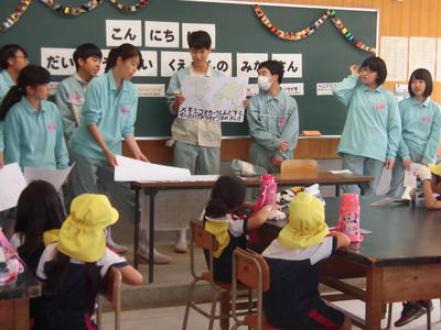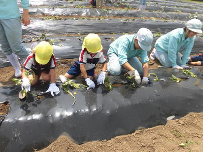 生活科学科では、大道保育園の園児さんたちと交流学習を行いました。今回は、サツマイモの苗植えです。 まずは、紙しばいです。 園児さんたちは、今回も大変楽しみにしてくれていたようで、暑い中、手袋を保育園からはめてきてくれました。 ねえねえ、早く畑に行こうよ。 なぜか、大人の園児さんも(?) 後は、ひたすらサツマイモを植える、植える。 あっち向いたり。 こっち向いたり。 そして、みんなで並んで、植える。 もう、疲れたねぇ。 いやまだ、植えようよ。待ってー。 最後に、指遊びをして。 カエルさんのプレゼント。 それから、お姉さんお兄さんに名前を覚えてもらおうと、園児さんはおそろいのユニフォームでした、何と素敵なことでしょう! 大道保育園のみなさん、暑い中、ありがとうございました。 サツマイモ、しっかり育てますね。がんばります。