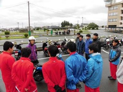 全体説明の後、2班に分かれての講習となりました。 実技では、コースを走行して原付バイクの運転技術を学びます。 |