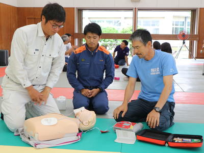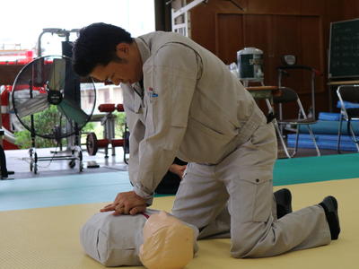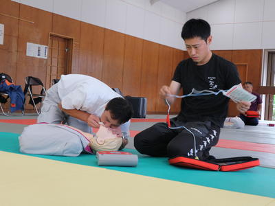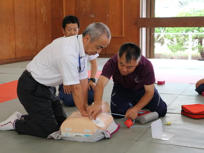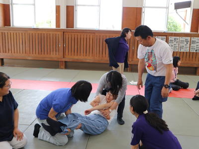 本校は7月2日(火)~5日(金)まで、1学期の期末考査が行われています。 試験初日の午後を利用して、職員対象の心肺蘇生法研修会を行いました。 講師として山鹿消防署から4名の消防隊員・救急救命士の方に来ていただきました。 まず10分ほどのDVDを視聴しました。フットサルの試合中に心臓が停止、心肺蘇生とAEDで蘇生し社会復帰した人を取り上げたものです。ご本人へのインタビューもあり、先生たちは見入っていました。 その後、実技に移りました。 デモンストレーションの後、 4つの班に分かれて、実践あるのみ! 疑問に思ったことは、その都度質問しました。 最後に意識不明者の搬送法も教えていただきました。 もちろんやってみます! 搬送後の安全な体位についても教えていただき
