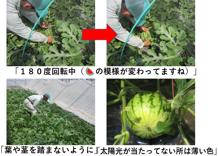 スイカをそのまま成長させると変形したり果皮が変色するので現在の位置から180度回転させることでそれらを防ぐことが出来るようになりました。