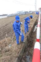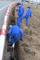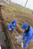 近づいてみると、鎌(かま)、鍬(くわ)、フォークを持った生徒たちが、実習田周りの水路の清掃(溝さらい)を行っていました。