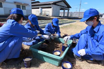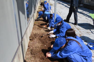 2月とは思えないポカポカ陽気の中、生活デザイン科の1年生が温室脇を掘り返していました。