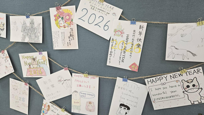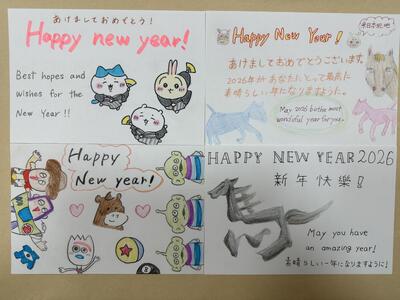 昨年、本校の2年生が心を込めて、台湾高雄市立六亀高級中学の生徒さん宛に年賀ハガキを書きました。こちらがその一部です。日本語、中国語、英語でのメッセージ + 手描きのイラストです。