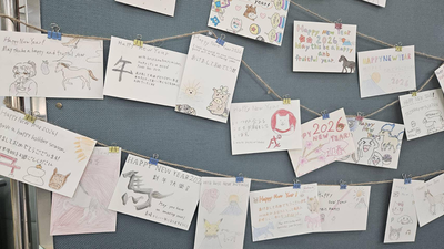 皆さんの年賀状は本校図書館前に展示し、生徒や教職員も心のこもった祝福のメッセージを楽しめるようにしています。添付の写真をご覧ください。