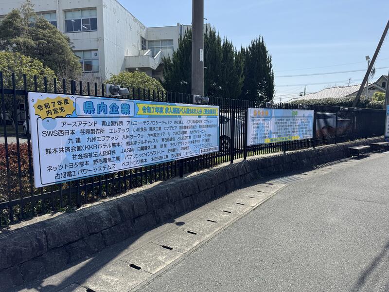 今回の看板では、令和7年度の進路実績として、県内企業・県外企業への内定状況や進学先を一覧で紹介しています。