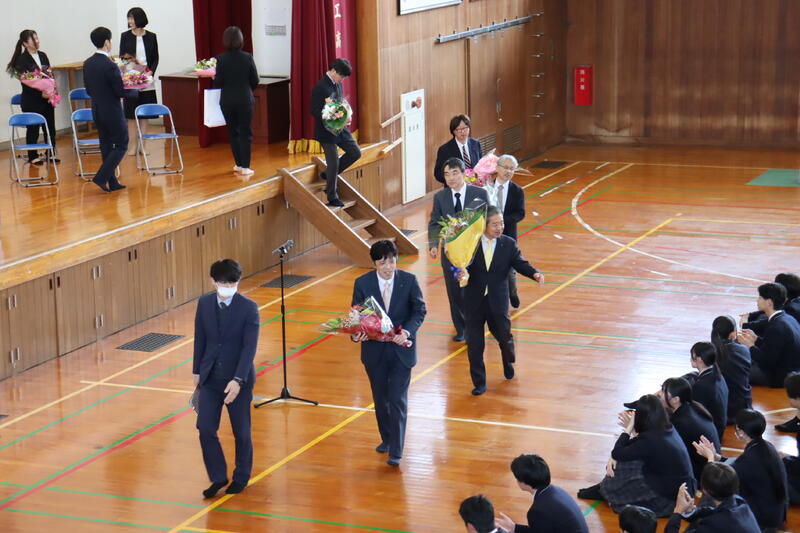 校長先生、教頭先生をはじめ、今年度は13名の先生方が本校を離任されることとなり、全校生徒・教職員が一堂に会して、その門出を見送りました。