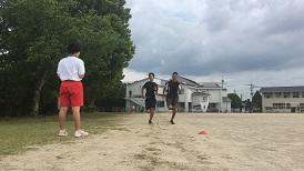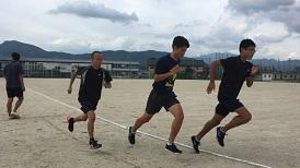 私たち陸上競技部は男子9人、女子1人で活動しています。学校の運動場やサイクリングロード、近くの神社などで毎日練習に取り組んでいます。長い距離を自分のペースで走ったり、時間と本数を決めてタイムトライアルをしたり、日によって様々なメニューを取り入れています。次の目標は秋に行われる駅伝大会に出場し、メンバーそれぞれの目標タイムを達成しチームとしてよい結果を残すことです。夏の暑い時期を走りきり、体力をつけていきたいと思います。