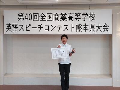 6月24日(土)水前寺共済会館において第40回全商英語スピーチコンテストが開催されました。5年ぶりに有観客での実施で会場は緊張感に包まれていました。本校からは情報管理科2年の梅田君(鹿北中出身)がレシテーション部門に出場しました。レシテーション部門は与えらえたスピーチ原稿を3分程度で表現するものです。梅田君は「Friendship」というスピーチを見事に披露し、優秀賞を受賞しました。毎日英語科の先生方と練習を積み重ねた成果が発揮でき、とてもよい経験となりました。