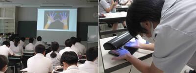 講話後は、実際に手を洗った後にどれだけ菌が付着しているかをブルーライトで確認しました。
