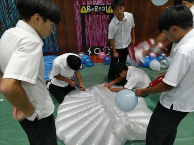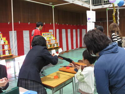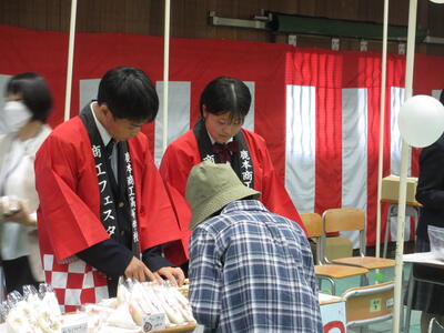 ブース準備の前は、多目的ホールで挨拶、金銭授受の練習を行いました。