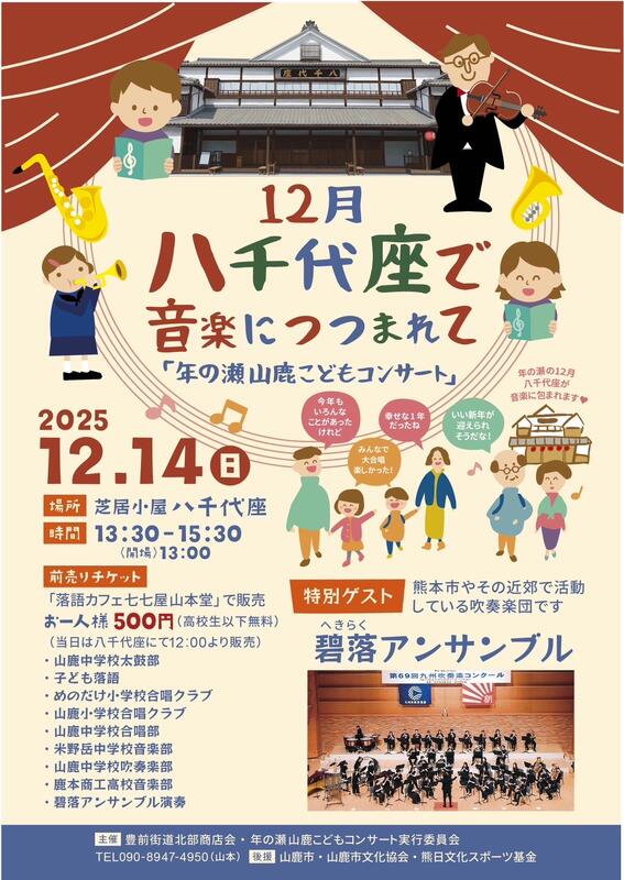 山鹿市の歴史ある芝居小屋・八千代座 にて開催される「年の瀬山鹿こどもコンサート」に、本校音楽部が出演します。