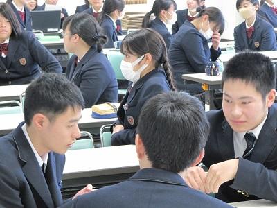その後、交流を深めるため3年生と1年生がそれぞれペアになって、高校生活で頑張ったことや苦労したこと、1年生のうちから取り組んでおいた方が良いこと、進路のことなど、フリートークを行いました。最初は互いに緊張していましたが、先輩からの熱いメッセージを受けて1年生も積極的に質問をしていました。高校生活を終えようとしている先輩方の頼もしく明るい笑顔が印象的でした。