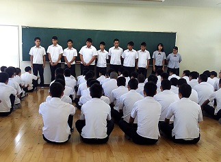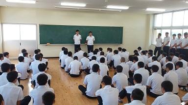 10月7日(月)科集会がありました。機械科では毎週月曜日の朝から3学年が集まって、機械科リーダーを中心に科集会を行っています。