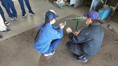 16日(月)2限目に山鹿分教室高等部1年生8人、先生方4人に1年生の実習の授業に参加していただき、交流学習を行いました。1年生の実習内容をすべて見学した後、溶接実習と旋盤実習を実際に体験してもらいました。恐る恐る作業に入りましたが、金属を切削したり、金属を温めたりというなかなか体験でなきいことを楽しんでもらえたと思います。