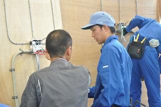 この授業には、熊本県電気工事業工業組合の御協力により、県内の電気工事業に従事されている方々に講師として来校していただき、電子機械科3年生6人に対して電気工事の技術指導をしていただきました。