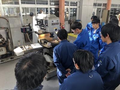 フライス削りとはフライス盤と呼ばれる工作機械を使用して、平面や溝を加工することができます。山鹿分教室の生徒さんは、初めて見る機械を目の当たりにして、興味心身に説明を受け、機械操作を体験していただきました。
