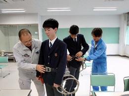 前半の授業では電気工事の仕事紹介や、電気工事業界について詳しく教えていただきました。また、後半はグループディスカッションで実際に働く方々から、仕事のやりがいや大変なこと、収入や仕事に必要な心構えなど、生の声を直接伺うことができました。実際に現場で活用されている腰道具を身につける体験においては、生徒達もその重さに驚きながら笑顔を見せていました。