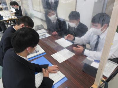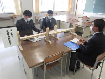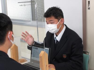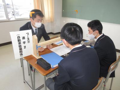 12月20日(水)に本校会議室にて「令和5年度電子機械科進路ガイダンス」を行いました。この取組は5年前から実施し、電子機械科の3年生が2年生に対して、対面方式で19ブースを設置したガイダンスです。内容は3年生が内定を勝ち取った企業先や進学先などをプレゼンソフトや求人票、実際の試験問題や面接の内容(報告書をもとに)、学校パンフレットなどを用いて説明をします。3年生の中には進路先の情報だけでなく、試験対策や面接練習の努力がいかに必要かなどを伝える生徒もいました。このように、来年の進路実現を見据えた2年生にとっては、非常に有益であるとともに、3年生も進路先を見直すよい機会であると思っています。