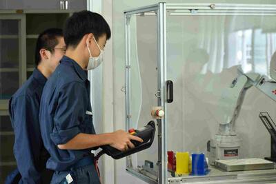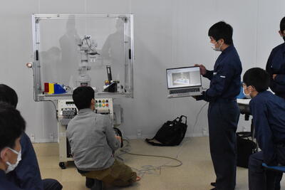 この産業用ロボットの設備は、令和3年度末に導入された最新設備の一つで、国のデジタルトランスフォーメーション(DX)政策のデジタル化対応産業教育設備として、電子機械科は活用させていただいています。また、この設備を活用する上で、高い技術を持っておられる「シナジーシステム株式会社」との連携で行っています。この場をお借りして、御礼申し上げます。
