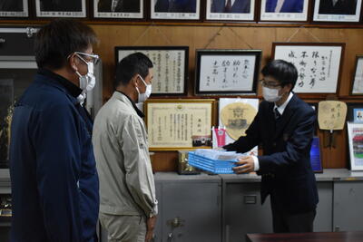 そこで、大会を今週末に控えた河口君に対して、7月11日(木)に熊本県工業高等学校長会様と本校同窓会様より助成金が、校長室で授与されました。顧問の藤本直樹先生と選手の河口雅翔君、きりっと引き締まった表情が印象的でした。