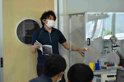 本校からエコ電部ロボット班の7人(電子機械科所属)が参加しました。初めに、本社(泗水町)でのロボット装置製造の現場見学、その後、場所をロボットセンター(菊池市野間口)に移して、様々な産業用ロボットのデモンストレーションを見ることで、実現可能な産業用ロボットのアイデアを創造します。