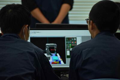 現在、電子機械科は、地元企業の「シナジーシステム株式会社」様の御協力で、4年前から産業用ロボット講習会等を本校で開催して、ロボット教育にも力を注いでいます。今年は「ものをつくる」体験は行いませんが、高校生も勉強している産業用ロボットの歴史や世界における日本の産業用ロボット業界の内容、種類や特徴などの知識を学び、実際にシミュレーション上で動かしたり、実機を操作する体験を行います。また、シナジーシステム株式会社様のご厚意で、産業用ロボットを用いたシステム(装置)を製造されている工場の見学も予定しています。
