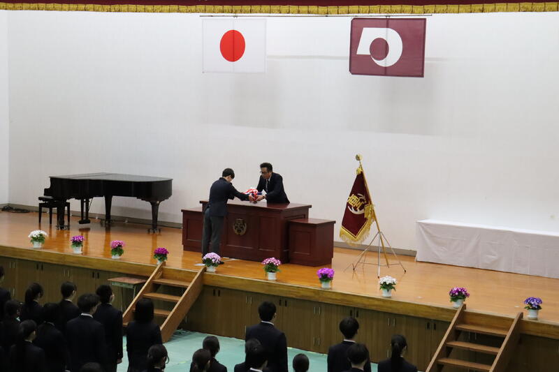 午後からは体育館に全校生徒が集まり、同窓会記念品贈呈式を実施。