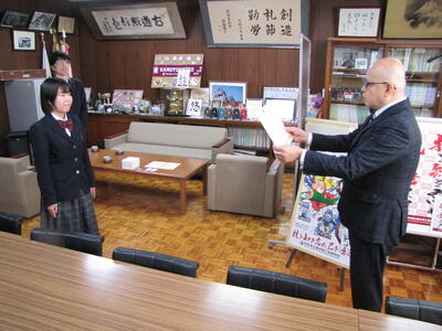 2名が税に関する高校生の作文において多くの募集の中で高く評価され、山鹿税務署から本校へ表彰がありました。