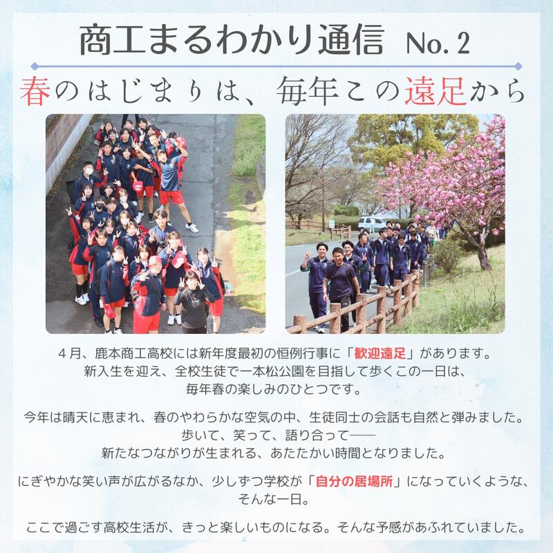 まるで新入生を歓迎してくれているかのような、すがすがしい青空のもと、鹿本商工高校の新年度恒例行事「歓迎遠足」を実施しました。