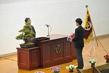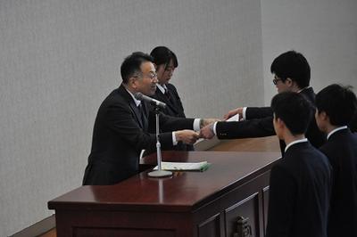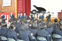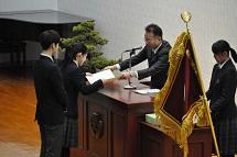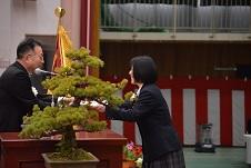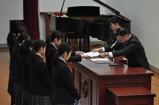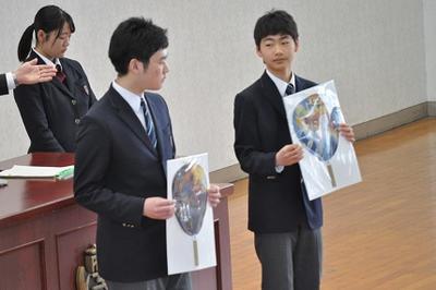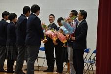 明日の卒業式を前に、同窓会からの記念品贈呈式と3年生の表彰式が行われました。記念品贈呈式では、西山会長から「答えのない二択を迫られることもある。正解はわからないが、すすんだ道を一生懸命頑張ってください。」とお祝いの言葉と共に、卒業証書入れとDVDを記念品としていただきました。