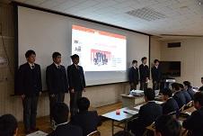 校長先生から「勤労観について深め、多くの年代の方と接する良い機会なので、コミュニケーション力を高めましょう。」とインターンシップの意義や目的についてお話がありました。その後、商業科2年の角孝太郎くんが、生徒を代表して誓いの言葉を述べました。