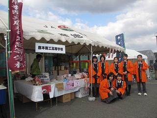 平成31年3月16日(土)に、商業科2年4人、情報管理科2年1人、情報管理科1年2人が『ファーマーズマーケット夢大地館9周年祭』(JAかもとファーマーズマーケット夢大地館:山鹿市鹿央町)で販売実習を行いました。前日の雷雨がイベントに影響しないか心配されましたが、とても良い天気に恵まれ、たくさんの方々が来場されました。