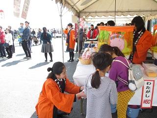 マーケティング部では、菊池川流域が2000年前から「米づくり」を支えてきたということから、山鹿産の米粉を使用した『鹿本商工ら(カモトショコラ)』の販売をしました。初めてのイベントで販売数の予想が難しかったのですが、ステージでのPR効果もあり、準備した150個があっという間に完売しました。他にも山鹿の観光名所を飴にした『山鹿めぐり』や復興支援の寄付金付きの『くまモンクリアファイル』を販売し、生徒の共同開発商品をみなさんにお買い上げいただき、菊池川流域のたからもの発見に貢献することができました。