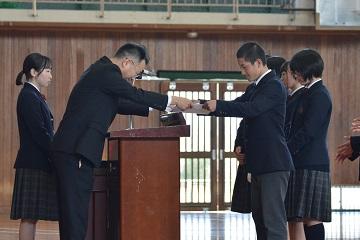 その後に行われた表彰式では、全国や県から表彰を受けた多数の生徒が壇上にあがりました。立派な姿で賞状や盾を受け取り、明日の卒業式に華を添えてくれました。