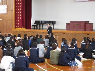 前半は中高生の現状や避妊のこと、性病のことについて話がありました。後半は日頃、助産師としてお仕事をされていてる立場から、妊娠や出産の大変さと素晴らしさ、そして神秘さについてお話をされました。最後には母親として「子」への想いをのせた動画を流されました。涙を流しながら見ている生徒もたくさんいました。お忙しい中、講演いただきありがとうございました。