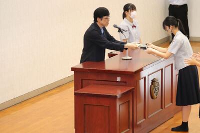 表彰式では、夏休み中などに頑張った生徒たち9名が表彰されました。